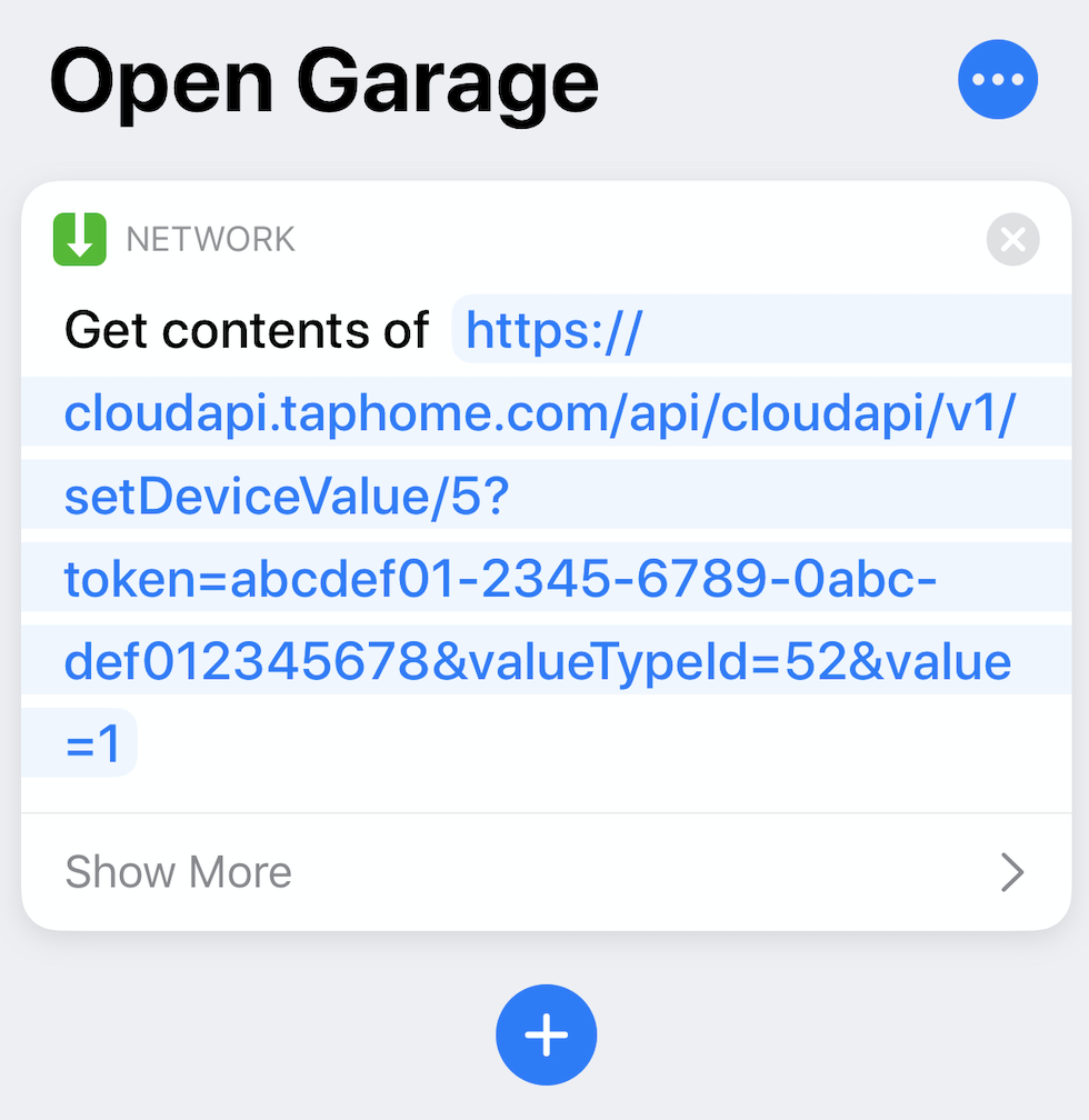 - Example: Pressing a button to open the garage door: https://api.taphome.com/api/TapHomeApi/v1/setDeviceValue/5?token=abcdef01-2345-6789-0abc-def012345678&valueTypeId=52&value=1