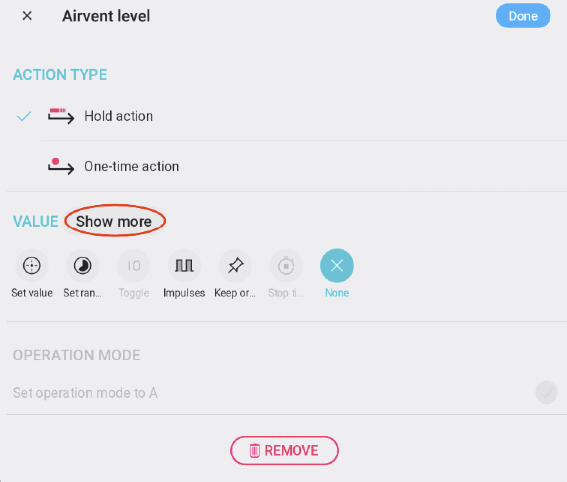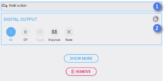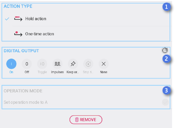 1. Action type - all available options, Hold action and One-time action (if applicable)