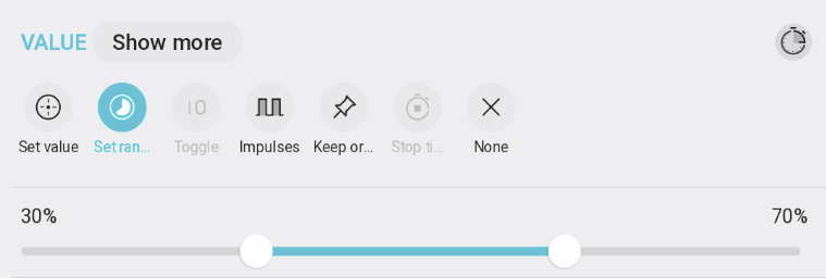 Example: Dimmed hallway light with push button and motion sensor. You want the button to turn the light to 100%, but the motion sensor should only set it to 20%. To avoid a situation where the user first turns on the light with the button to 100%, but then the motion sensor immediately detects them and reduces the value to 20%, the motion sensor should use “Set range: 20-100%”. This way, when motion is detected, the value is set to the closest value within the defined range. If the light was at 0%, it will be set to 20%, but if it was anywhere between 20-100%, it will keep its current value and not be reduced back to 20%.