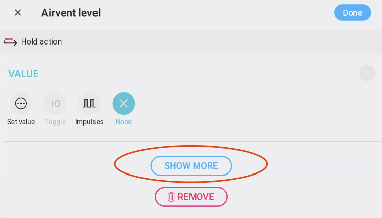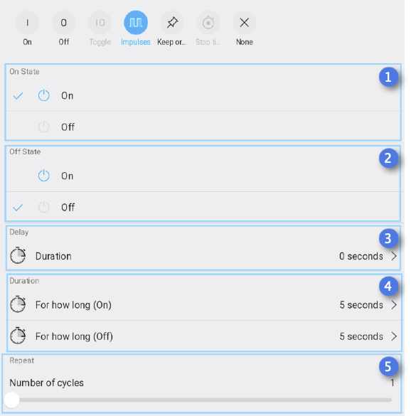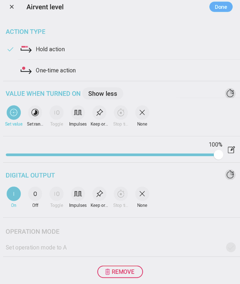 1. One-time action - the action takes place once and immediately afterwards the Smart rule no longer controls the respective output. This type of action is typical for push buttons that works like an impulse but could be used for other devices. Icon for One-time action is not filled, just contoured by accent color.